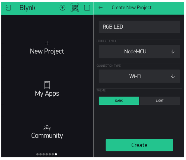 安裝成功后,打開應(yīng)用程序,點(diǎn)擊“新建項(xiàng)目”。然后它將彈出一個(gè)新屏幕,我們需要在其中設(shè)置項(xiàng)目名稱、Board和連接類型等參數(shù)。對(duì)于這個(gè)NeoPixel ESP8266項(xiàng)目,選擇設(shè)備為NodeMCU,連接類型為Wi-Fi,然后點(diǎn)擊“創(chuàng)建”。