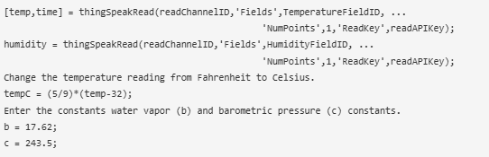 現(xiàn)在,當(dāng)傳感器數(shù)據(jù)通過ThingSpeak通道傳輸時(shí),我們將使用MATLAB分析工具使用溫度和濕度數(shù)據(jù)計(jì)算露點(diǎn)。它從氣象站頻道讀取溫度和濕度數(shù)據(jù)。計(jì)算出露點(diǎn)后,將該數(shù)據(jù)與溫度和濕度數(shù)據(jù)一起寫入新的通道。