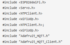 首先,包括所有必需的庫。ESP8266 Wi-Fi和Servo.h庫已經(jīng)安裝在IDE中。您可以從以下鏈接下載NTP客戶端和Adafruit MQTT庫: