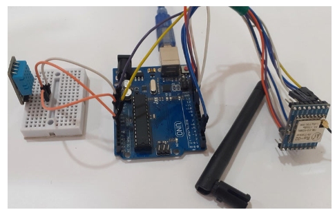 在發(fā)送端,我們將使用帶有LoRa模塊和DHT11傳感器的Arduino UNO。Arduino UNO與LoRa和DHT11的接口如下圖:
