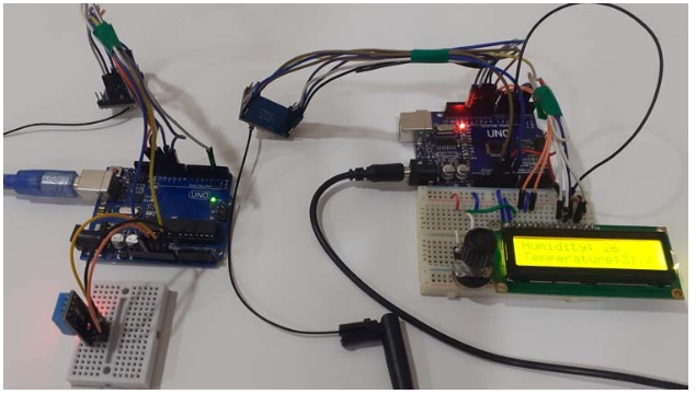 在void循環(huán)函數(shù)中,我們使用DHT.readTemperature()和dht . read濕度()函數(shù)計(jì)算溫度和濕度值,并開始傳輸這些值。在接收端,將這些值打印在16x2液晶顯示器上。我們使用關(guān)鍵字“c”提示接收器在第2行打印以下信息。