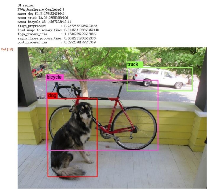 Tiny YOLO 模型在 ZU3EG 上顯示檢測(cè)結(jié)果的實(shí)時(shí)輸出,視頻幀中標(biāo)注了檢測(cè)到的對(duì)象
