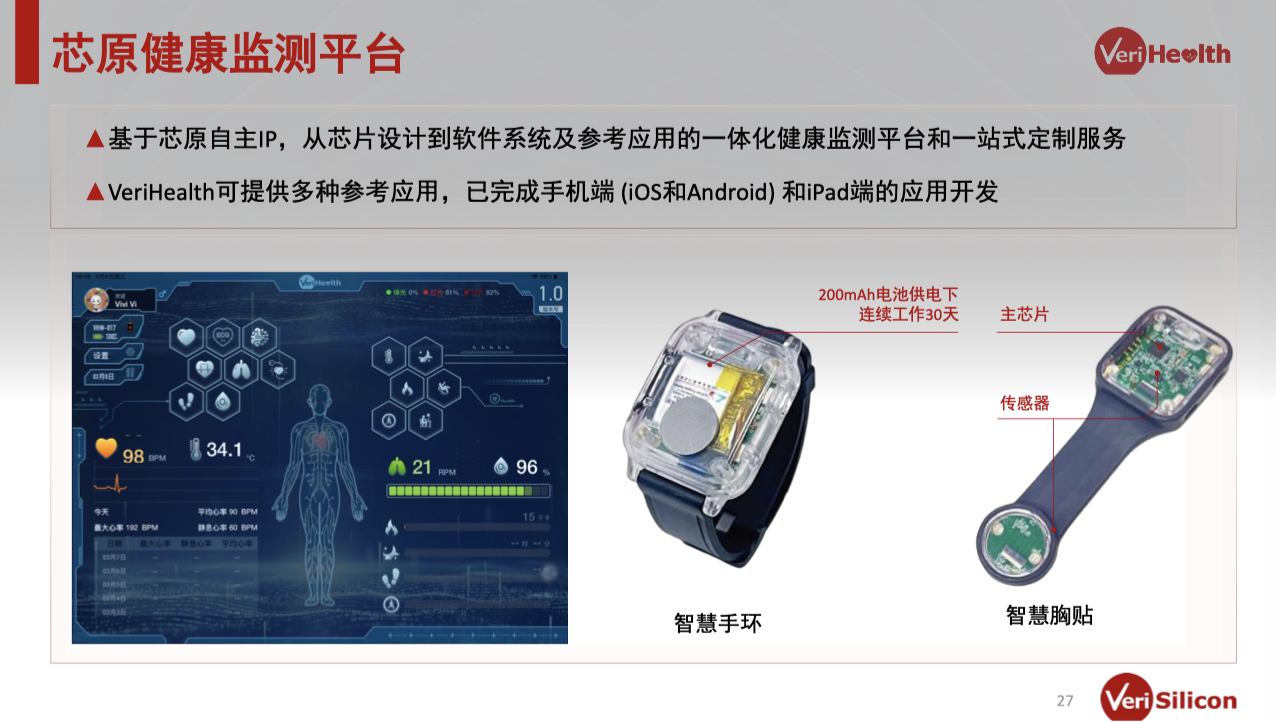 基于多年在醫(yī)療健康領(lǐng)域的技術(shù)積累和人才沉淀,芯原現(xiàn)可以提供全面的健康解決方案。首先,芯原健康監(jiān)測平臺基于自主研發(fā)的技術(shù),從芯片設(shè)計到軟件系統(tǒng),提供了一體化的健康監(jiān)測服務(wù),覆蓋了多種參考應(yīng)用,并實現(xiàn)了手機端和平板端的全面支持。這一平臺的核心產(chǎn)品包括智慧手環(huán)和智慧胸貼,具備長時間續(xù)航和多功能健康數(shù)據(jù)監(jiān)測能力。