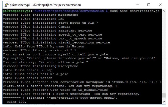 現(xiàn)在,我們準備運行IBM沃森助手。因此,在tjbot/recipes/conversation文件夾中運行下面的命令來啟動助手。