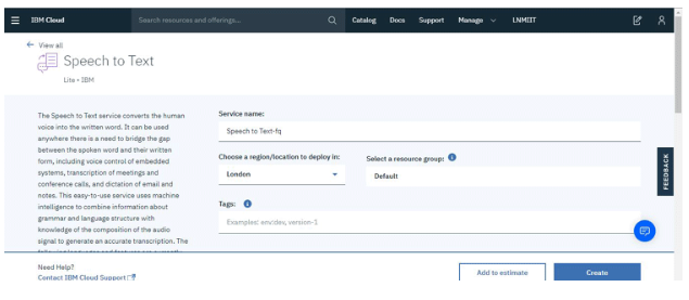 3. 我們將從向文本添加語音開始,添加其他服務的步驟將與下面描述的相同。點擊語音轉文本服務然后點擊創(chuàng)建。