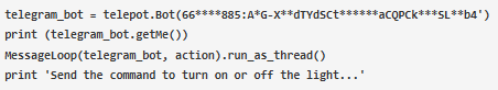 下面給出的代碼使用我們在創(chuàng)建bot時獲得的唯一令牌號來建立telegram bot和Raspberry Pi之間的連接。在成功連接時,它打印一條消息,表明系統(tǒng)已準(zhǔn)備好接受該命令。