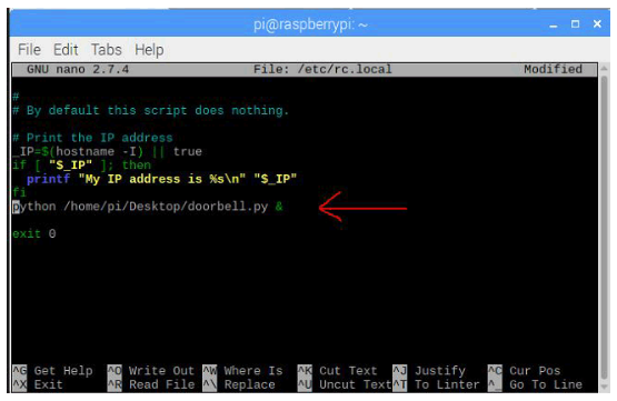在“exit 0”之前粘貼python /home/pi/Desktop/doorbell.py &,如下圖所示,使用ctrl+x保存文件并回車。確保您輸入了正確的python腳本目標(biāo)。