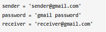 3. 在變量中指定您的電子郵件id、收件人電子郵件id和密碼,如下所示。