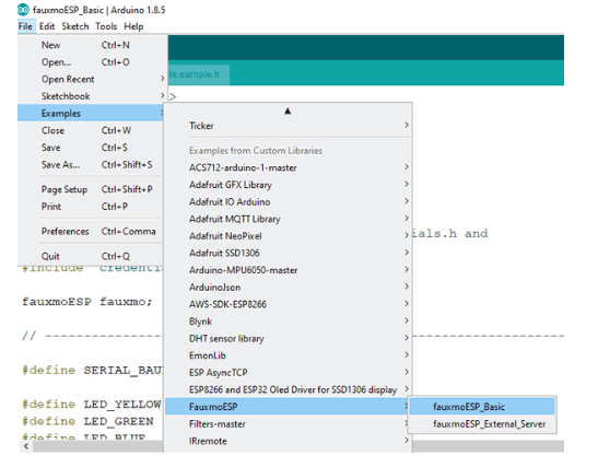 4. 在fauxmoESP中有一個用于控制設(shè)備的示例代碼,我們必須修改這個示例。打開Arduino IDE并進(jìn)入Examples -> FauxmoESp -> fauxmoESP_Basic。