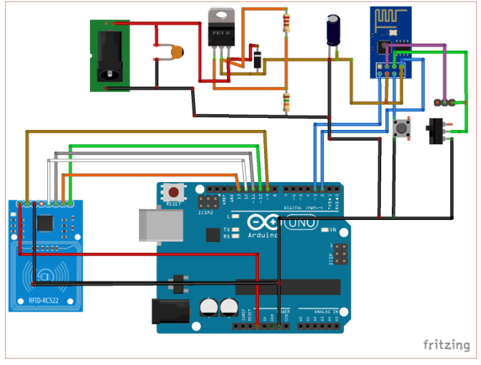 RFID智能考勤系統(tǒng)的完整電路圖如下所示。電路圖是用Fritzing軟件制作的。