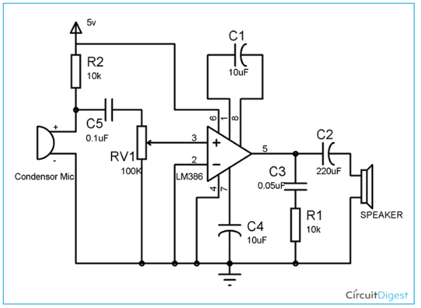 這個電路圖取自這個鏈接LM386基于音頻放大器電路,通過這個鏈接了解更多關于這個放大器的功能。