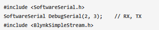 2. 現(xiàn)在,包括software serial和Blynk函數(shù)的頭文件,并為software serial創(chuàng)建一個(gè)實(shí)例DebugSerial。