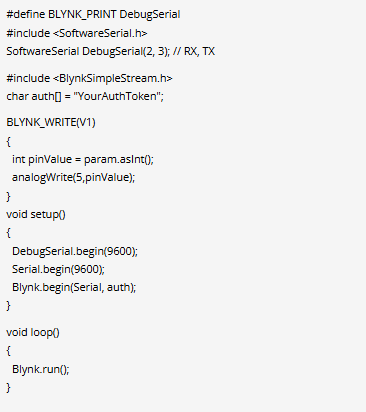 6. 用于切換LED的代碼內(nèi)置在Blynk.run()函數(shù)中,但我們必須創(chuàng)建一個(gè)用于從智能手機(jī)獲取滑動(dòng)條值的函數(shù)。有兩個(gè)函數(shù)用于發(fā)送和接收數(shù)據(jù),即BLYNK_READ()和BLYNK_WRITE()。這些函數(shù)將虛擬引腳作為讀取和寫入數(shù)據(jù)的輸入?yún)?shù)。因此,我們必須使用BLYNK_WRITE函數(shù)從Blynk應(yīng)用程序?qū)懭胩摂M引腳V1上的數(shù)據(jù)。