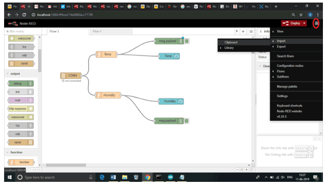 如上所述,該程序用于將濕度值從ASCII碼格式更改為實(shí)際值。完成溫度和濕度功能后,向下滾動(dòng)并將兩個(gè)Debug節(jié)點(diǎn)拖到流程部分。