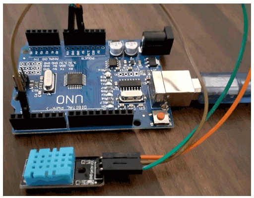 正如你所看到的,我已經(jīng)使用了簡(jiǎn)單的雌性到雄性的連接線來進(jìn)行連接。完整的設(shè)置是由連接到我的電腦的USB端口供電。我們之前將DHT11與Arduino連接,構(gòu)建物聯(lián)網(wǎng)氣象站。