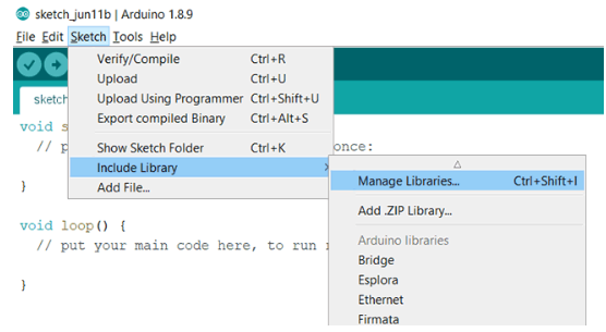 打開Arduino IDE并轉(zhuǎn)到Sketch ->包括庫->管理庫。