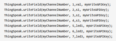 最后,使用函數(shù)ThingSpeak. writefield()將數(shù)據(jù)上傳到ThingSpeak云端。它需要通道號,字段號,數(shù)據(jù)(您想要在各自的字段中上傳)和編寫API密鑰。在這里,我們將LDR傳感器數(shù)據(jù)、IR傳感器數(shù)據(jù)和led數(shù)據(jù)上傳到ThingSpeak云。