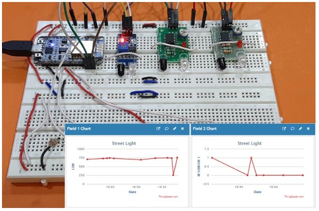 大多數(shù)地方都有自動路燈,可以感知白天和黑夜,并根據(jù)晝夜自動打開和關(guān)閉。在這里,我們擴展了這個項目,增加了一個額外的限制來打開燈,路燈只會在黑暗中發(fā)光,有人穿過街道。該項目的主要目標是通過只在需要時發(fā)光路燈來減少電力消耗。在這個項目中,我們展示了智能路燈的原型,它有3個紅外傳感器,1個LDR傳感器和3個led,每個led代表一個路燈。我們還將更新LDR傳感器數(shù)據(jù)到ThingSpeak,并從世界任何地方通過互聯(lián)網(wǎng)控制led(路燈)。