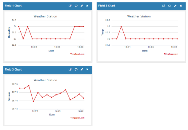 此外,我們將氣象站的數(shù)據(jù)發(fā)送到ThingSpeak,以便從世界任何地方進行實時監(jiān)控,我們可以在網(wǎng)站上查看記錄的數(shù)據(jù)和隨時間變化的圖表。您也可以選擇任何其他物聯(lián)網(wǎng)平臺來監(jiān)控實時數(shù)據(jù)。