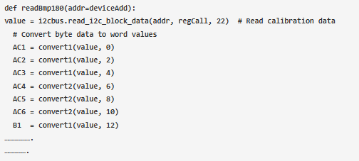 def readBmp函數(shù)從BMP180傳感器讀取數(shù)據(jù),并將數(shù)據(jù)從字節(jié)轉(zhuǎn)換為字值。
