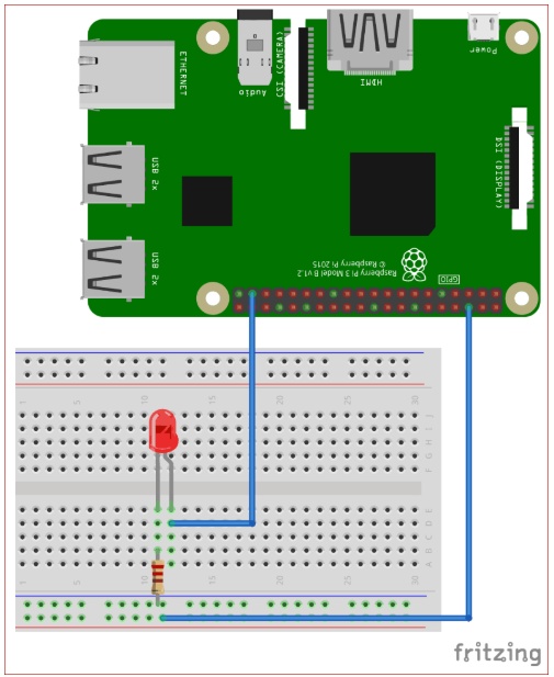 LED的正引腳與Pi的GPIO26連接,負(fù)引腳與接地地通過250歐姆電阻連接。
