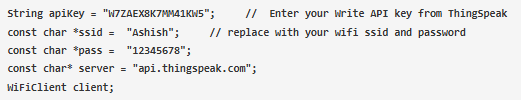 在本節(jié)中,您必須從ThingSpeak服務(wù)器輸入您的Write API密鑰,并給出您的熱點(diǎn)的SSID和密碼。