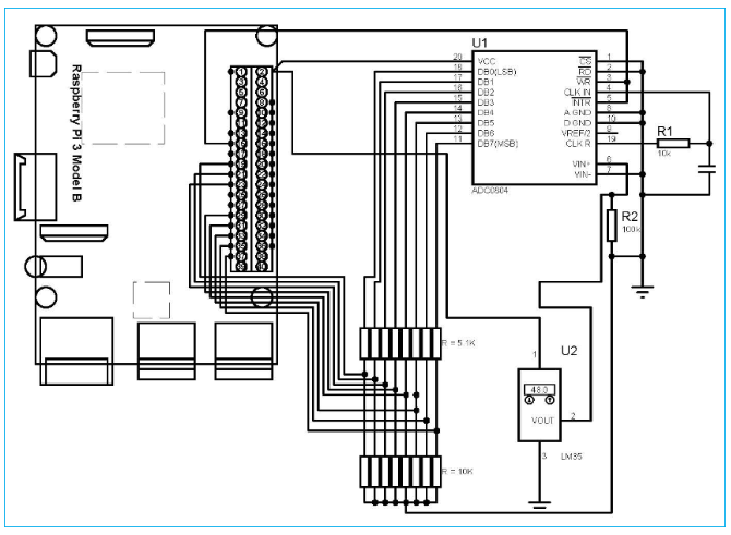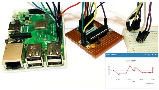 在之前的項(xiàng)目中,我們學(xué)習(xí)了如何使用樹莓派向物聯(lián)網(wǎng)平臺ThingSpeak發(fā)送數(shù)據(jù)。在這個DIY教程中,我們將把LM35溫度傳感器數(shù)據(jù)發(fā)送到ThingSpeak云來構(gòu)建一個溫度監(jiān)測系統(tǒng)。使用ThingSpeak,我們可以記錄和監(jiān)控世界上任何地方的溫度。這個基于物聯(lián)網(wǎng)的溫度監(jiān)測器是使用樹莓派,ADC0804和LM35溫度傳感器構(gòu)建的。樹莓派使用ADC從LM35讀取當(dāng)前溫度,并將其發(fā)送到ThingSpeak服務(wù)器,以便從世界任何地方進(jìn)行實(shí)時監(jiān)控。
