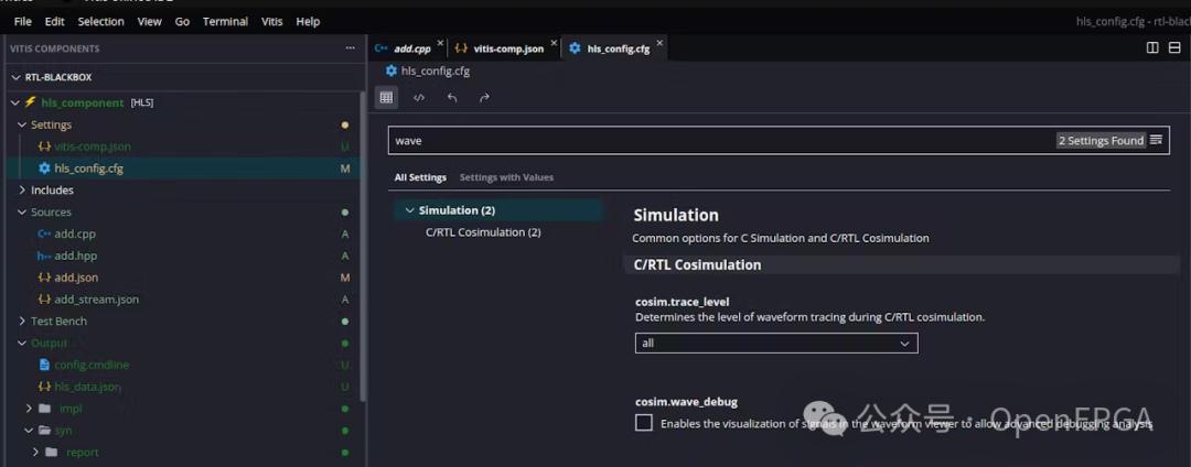 單擊 hls_config.cfg 文件,在 Vitis GUI 的幫助下將 cosim.trace_level 更改為全部并運(yùn)行聯(lián)合仿真。