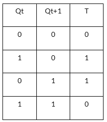 勵(lì)磁表說明了觸發(fā)器從當(dāng)前狀態(tài)進(jìn)入下一個(gè)狀態(tài)所需的勵(lì)磁。這是T觸發(fā)器的激勵(lì)表。這里,當(dāng)T = 0時(shí),Qt+1與輸入Q相同,當(dāng)T = 1時(shí),Qt+1是輸入Q的補(bǔ)。