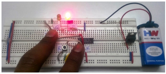 按鈕T(切換),R(復(fù)位),CLK(時(shí)鐘)是T觸發(fā)器的輸入。兩個(gè)led Q和Q '表示觸發(fā)器的輸出狀態(tài)。9V電池作為穩(wěn)壓器LM7805的輸入。因此,穩(wěn)壓的5V輸出用作IC的Vcc和引腳電源。因此,對于T處的HIGH和LOW輸入,可以通過LED Q和Q '看到相應(yīng)的輸出。