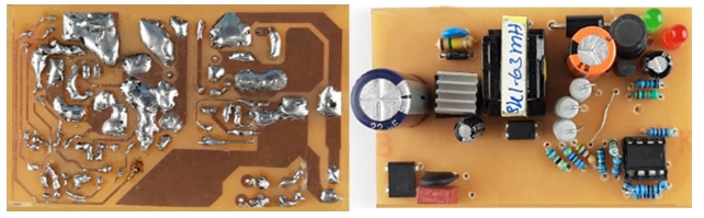 為了方便和測(cè)試,我們制作了一個(gè)手工版的PCB,焊接后的頂部和底部如圖所示。