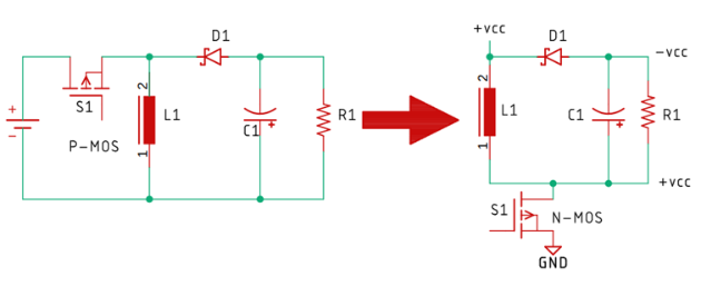 正如您在上面左側的原理圖中所看到的,我們的反相降壓升壓轉換器使用p溝道MOSFET作為開關,但p溝道MOSFET的一大缺點是其內(nèi)阻。如果我們考慮一個通用的IRF9540 p溝道MOSFET,它的內(nèi)阻是0.22R或220ms,但如果我們考慮它的互補n溝道的IRF540,它的內(nèi)阻是0.077R或77ms,比p溝道小3倍。這就是我們決定修改電路的原因。我們這樣做是為了使用n溝道MOSFET來驅動電路,左邊的上述簡化電路正好顯示了這一點。它使用n溝道MOSFET而不是p溝道1。