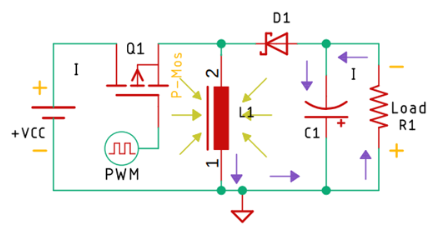 如圖所示,該電路由電感、二極管、作為開關的MOSFET和電容器組成。我們用一個開關信號來操作這個電路。由于使用的MOSFET是p溝道MOSFET,當脈沖低時它打開,當脈沖高時它關閉?,F(xiàn)在,當MOSFET打開時,電感充電并建立其能量;當這種情況發(fā)生時,二極管阻止電容器充電。