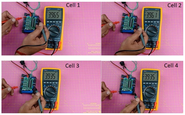 來自充電器的電壓為17.91V,而電池的正負端電壓為16.29伏(由于我已將萬用表的探頭連接在相反的端子上,因此它具有負電壓)。電壓輸出的差異是由于BMS將4s電池從BMS輸出端斷開,從而停止了充電器對電池的供電,因此表明BMS的過壓保護起作用。