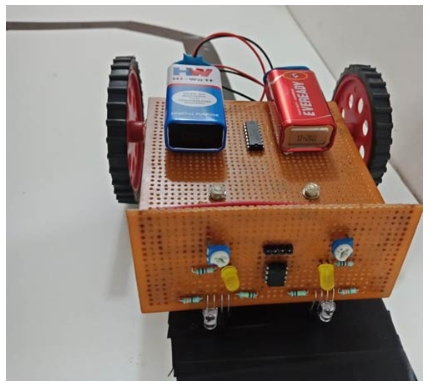 一旦我們理解了所有組件的連接,我們就可以開始組裝我們的跟隨線機器人。為了制造這個機器人,首先,我們需要一個機器人的底盤。這里我們使用了一個簡單的現(xiàn)成的機器人底盤。然后,我們在一些熱熔膠的幫助下,將帶有IR電路和控制器電路的BO電機放置到底盤上,如下圖所示。