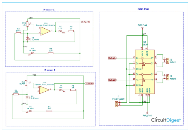 正如您所看到的,我們將黑線跟隨機器人電路分為三個部分,其中兩個部分用于構(gòu)建紅外傳感器,一個用于使用L293D電機驅(qū)動器IC構(gòu)建控制器電路。