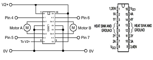 L293D是一個電機驅(qū)動IC,用于驅(qū)動電機(也就是機器人的輪子)。如L293D IC的引腳所示,它可以控制兩臺電機。它可以根據(jù)提供給電機的電流改變電機的速度;它可以根據(jù)輸入控制電機的方向;它也可以啟動或停止電機。