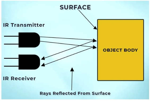 當紅外LED發(fā)射紅外線時,如果有任何物體阻擋了紅外線,物體的表面就會反射紅外線,而紅外光電二極管對這些射線很敏感。紅外光電二極管接收這些反射的紅外射線,因此,電阻和輸出電壓相應(yīng)變化。利用這種輸出電壓(或光電二極管的電阻)的變化,我們可以構(gòu)建邏輯電路。這就是紅外傳感器的基本工作原理;我們將使用它來檢測線路的存在?,F(xiàn)在,當白色表面存在時,紅外線會被反射,但黑色表面會吸收。因此,我們將能夠檢測到黑線存在的位置,并且我們可以構(gòu)建一個邏輯電路來跟蹤這條線。紅外發(fā)射器和接收器的工作原理如圖所示。
