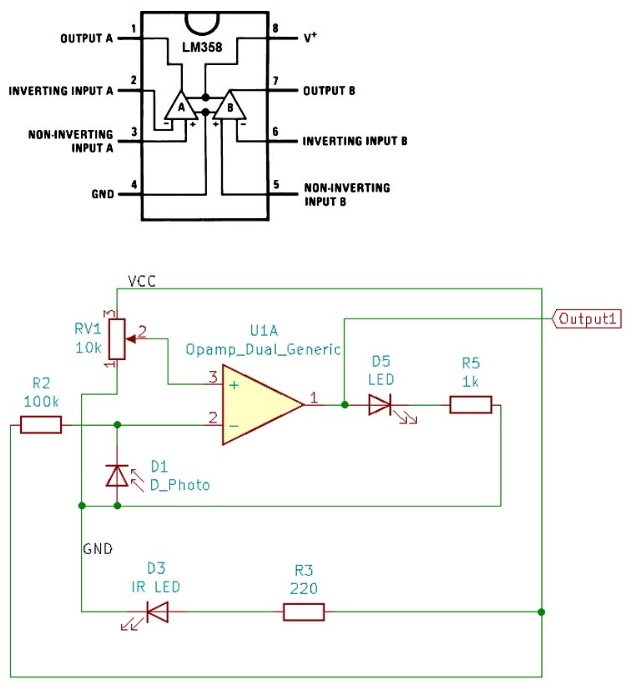 LM358的引腳和紅外傳感器的電路連接如下圖所示。我們使用一個LM358集成電路來控制兩個紅外傳感器。LM358上電使用VCC和GND引腳,分別為8和4。LM358是一個運算放大器比較器IC,提供高輸出(VCC,在我們的情況下,9V)。光電二極管反向偏置,分壓器使用100k電阻創(chuàng)建,并作為輸入饋送到反相終端。另一個分壓器是使用10k預(yù)設(shè)創(chuàng)建的,并作為輸入給一個非反相引腳,引腳3的比較器。紅外LED通過使用VCC和GND正向偏置供電。引腳1是輸出,因此我們將LED與限流電阻連接,并從這里將傳感器的輸出作為電機驅(qū)動器的輸入。