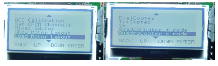 step1:首先按下S4進入菜單,然后進入負載電機布局,然后選擇四軸直升機X模式,并在X模式下設置四軸直升機。檢查這里所有的電機方向。