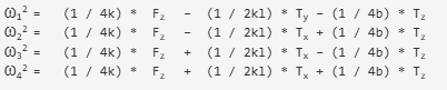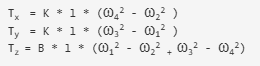 這里有4個電機,電機1和3在連續(xù)方向上旋轉,電機2和4在連續(xù)方向上旋轉。?1、?2、?3、?4分別為電機1、電機2、電機3、電機4的角速度。l是垂直于表面的Z軸與對角相對的電機之間的距離。