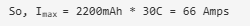 這意味著2200mAh 30C 3S LiPo可以提供高達66安培的最大電流。