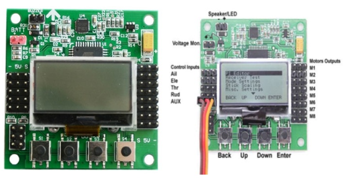 Kk2.1.5多旋翼LCD飛控板基于ATML644 PA。板的右側有8個輸出,我們將使用4個輸出直接連接esc。我們將使用四軸直升機,所以我們只使用了四個輸出引腳。