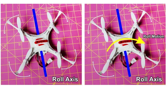 從無人機的后面到無人機的前面的軸稱為角色軸,圍繞這個軸的旋轉稱為角色運動。這種運動也被稱為副翼。在下面的圖像中,我們可以看到滾動運動。