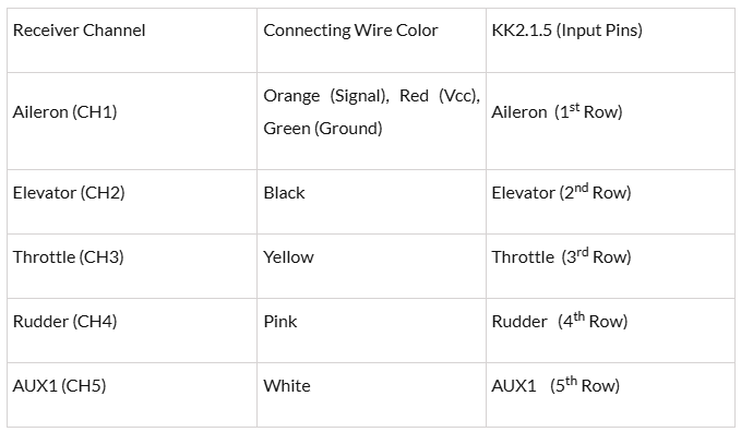 輸入管腳在LCD顯示屏的左側。這里有5個連接,這些引腳將與接收器連接。接收引腳與KK2.1.5輸入引腳的連接方式如下: