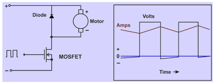 通過脈沖寬度調制(PWM),控制器與電機的開關連接每秒連接和斷開約2000次。MOSFET晶體管被用作開關而不是機械開關。開關速度快,電機無法檢測到。如果有24V電池連接,只有一半的時間,電機看到電池像12v,以半速運行。開關的速度也會影響電機的電感,從而保持電機電流的持續(xù)流動。然而,電流只有一半的時間從電池流出,所以電池電流將是電機電流的一半。在下圖中,我們可以看到ESC的內部電路圖及其電流(安培)隨時間的響應。