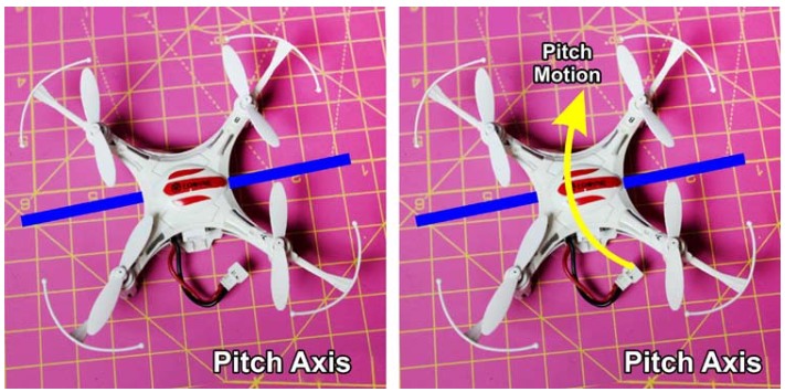 從無人機的左側到右側的軸稱為俯仰軸。圍繞這個軸的旋轉稱為俯仰運動。它也被稱為電梯運動。在下圖中,我們可以看到音高運動。