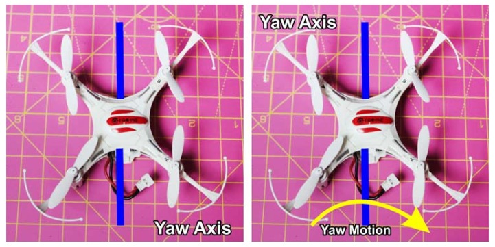 從無人機頂部到無人機底部的軸稱為偏航軸。圍繞這個軸的旋轉稱為偏航運動。它也被稱為舵。在下圖中,我們可以看到偏航運動。