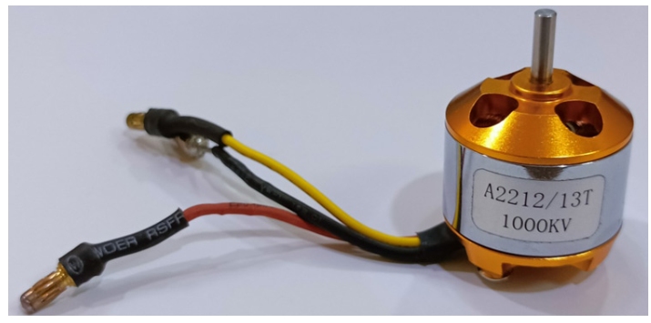 我們在這里使用了無刷直流電機(BLDC)。直流電動機由線圈和磁鐵組成,用于驅動軸,軸上有一個電刷,負責切換線圈中的功率方向。無刷電機沒有這些電刷。它們在電機的中心有線圈,固定在支架上。它們包含許多磁鐵,安裝在外部的圓柱體上,圓柱體連接到旋轉軸上。所以線圈是固定的。這意味著,電線可以直接到達它們,因此不需要刷子。無刷直流電動機以更高的速度旋轉,使用更少的功率比直流電動機(在相同的速度)。此外,也沒有功率損失,由于電刷過渡。如下圖所示。我們可以看到1000KV無刷直流電機,它有三條輸入線。我們將用電子速度控制器(ESC)連接這三根電線。