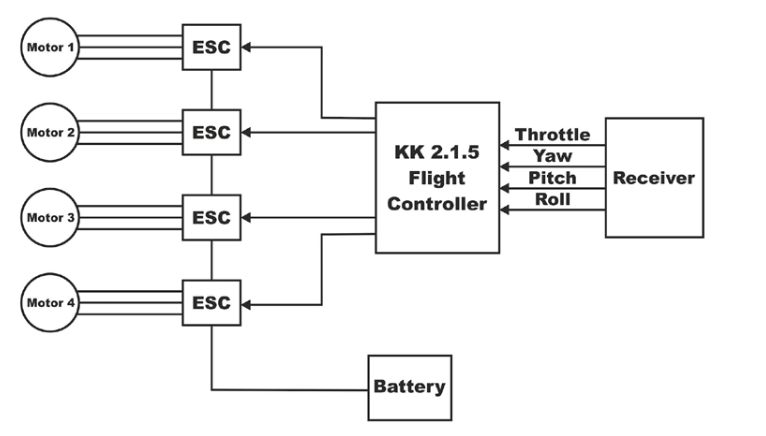 如下方框圖所示,所有電機均通過esc與KK2.1.5相連。加速度計和陀螺儀顯示在KK2.1.5板外,但它是內置在板本身。接收器與KK2.1.5板直連。在下面的圖像中,我們已經顯示了四軸直升機的框圖。